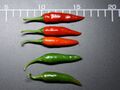| C. frutescens | Ají caballero · Bangalore torpedo · Bird's eye chilli · Cabai burong · Kurnool · Malagueta · Megh · Piri piri · Tabasco · Thai bangkok upright · Zimbabwe bird |