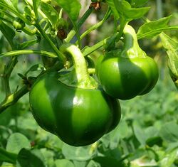 Doe hill golden plants produce small bell peppers before the larger ones come into season. The fruit turn from green to a golden-orange colour at maturity. The plant is a pre-1900 family heirloom from the Doe Hill area in Highland county, VA. It produces 4 to 6-lobed, bright orange, flat shaped bells, 6cm (2¼in) long and 2½cm (1in) wide. The 60cm (24in) plants are high yielding, widely adapted and disease resistant. The flavor is sweet with a fruity, multidimensional quality. A nice salad pepper for adding color, zip and extra vitamin C to early summer salads.[2]