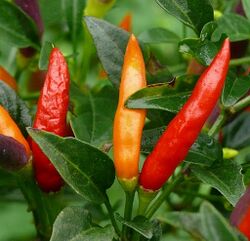 | C. frutescens | Ají caballero · Bangalore torpedo · Bird's eye chilli · Cabai burong · Kurnool · Malagueta · Megh · Piri piri · Tabasco · Thai bangkok upright · Zimbabwe bird |