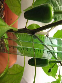 | A jalapeño plant with pods. The purple strips on the stem are anthocyanin, due to the growth under blue-green spectrum fluorescent lighting. |