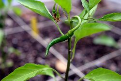 The Kung pao chilli is a large, fast growing 90cm (3ft) tall plant. They are loaded with skinny 15-23cm (6-9in) long thin walled cayenne-type fruit which mature from green to a dark rich red in 85 days. At around 10,000 scoville heat units, they are often used to spicy up Thai, Szechuan and other Southeast Asian dishes.[1]
