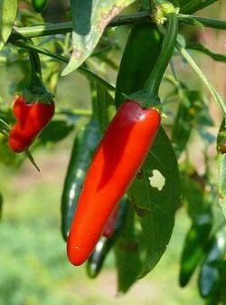 | C. annuum | Aleppo · Ammazzo · Anaheim · Antohi romanian · Apache · Ancho gigantea · Arizona chiltepin · Azr · Baby belle · Banana · Banana sweet · Bassotto · Beaver dam · Bell · Berbere · Bhavnagari long · Big bomb · Blushing beauty · Bolivian rainbow · Born fire · Bulgarian carrot · Buran · California wonder · Candlelight · Carmen · Cayenne · Cayenne long purple · Charleston hot · Chervena chushka · Cherry bomb · Cheyenne · Chilly chili · Chiltepin · Chimayo · Chinese five colour · Chocolate beauty · Chocolate bell · Ciliegia picante · Cobra · Cow horn · Crest · Cubanelle · Cyklon · Czechoslovakian black · Dagger pod · De árbol · Demon red · Devil · Doe hill golden · Don emilio · Dutch hot · Early jalapeño · Elephant trunk · Etna · Explosive ember · Fajita bell · Fire cracker · Fish · Fooled you · Gamba · Garden salsa · Garden sunshine · Giallo d'asti · Giallo di cuneo · Giant szegedi · Giant thai · Goat's weed · Golden heat · Golden horn · Golden nugget · Grande jalapeño · Guajillo · Gypsy · Hershey · Hidalgo · Hot portugal · Hot summer · Hungarian black · Hungarian hot wax · Hercules · Italian hot · Jalapeño · Jimmy Nardello · Joe Parker · Joe's long · King of the north · Krakatoa · Krimzon lee · Kung pao · Lamuyo · Lombardo · Marconi red · Mariachi · Melrose · Mirasol · Moragot · Navaho · NuMex big jim · NuMex twilight · Orange cayenne · Pasilla · Pasilla bajio · Pelita · Peppino · Pepperoncini · Pequin · Peruvian purple · Piccante de cayenne · Piccante rosso di caienna · Pico de gallo · Pimento · Pimento elite · Pimiento de padrón · Pinocchio's nose · Poblano · Pritavit · Purple beauty · Pusa jwala · Raja's pride · Red peter · Red ruffled pimiento · Riot · Rota basco · Roumanian rainbow · San ardo · Santa fe grande · Señorita · Serrano · Sheepnose pimiento · Shishito · Sigaretto di bergamo · Sizzler · Stavros Greek pepperoncini · Sunrise orange · Super cayenne · Super red pimento · Sweet cherry · Tequila · Thai dragon · Thai yellow · Thor · Turkish cayenne · Volcano · Watermelon · Wenk's yellow · Wisconsin lakes · Yellow belle · Yellow cayenne |