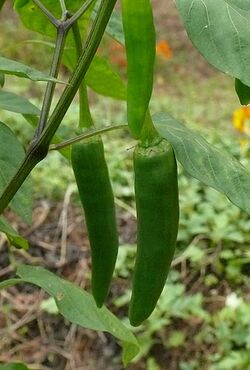 | C. annuum | Aleppo · Ammazzo · Anaheim · Antohi romanian · Apache · Ancho gigantea · Arizona chiltepin · Azr · Baby belle · Banana · Banana sweet · Bassotto · Beaver dam · Bell · Berbere · Bhavnagari long · Big bomb · Blushing beauty · Bolivian rainbow · Born fire · Bulgarian carrot · Buran · California wonder · Candlelight · Carmen · Cayenne · Cayenne long purple · Charleston hot · Chervena chushka · Cherry bomb · Cheyenne · Chilly chili · Chiltepin · Chimayo · Chinese five colour · Chocolate beauty · Chocolate bell · Ciliegia picante · Cobra · Cow horn · Crest · Cubanelle · Cyklon · Czechoslovakian black · Dagger pod · De árbol · Demon red · Devil · Doe hill golden · Don emilio · Dutch hot · Early jalapeño · Elephant trunk · Etna · Explosive ember · Fajita bell · Fire cracker · Fish · Fooled you · Gamba · Garden salsa · Garden sunshine · Giallo d'asti · Giallo di cuneo · Giant szegedi · Giant thai · Goat's weed · Golden heat · Golden horn · Golden nugget · Grande jalapeño · Guajillo · Gypsy · Hershey · Hidalgo · Hot portugal · Hot summer · Hungarian black · Hungarian hot wax · Hercules · Italian hot · Jalapeño · Jimmy Nardello · Joe Parker · Joe's long · King of the north · Krakatoa · Krimzon lee · Kung pao · Lamuyo · Lombardo · Marconi red · Mariachi · Melrose · Mirasol · Moragot · Navaho · NuMex big jim · NuMex twilight · Orange cayenne · Pasilla · Pasilla bajio · Pelita · Peppino · Pepperoncini · Pequin · Peruvian purple · Piccante de cayenne · Piccante rosso di caienna · Pico de gallo · Pimento · Pimento elite · Pimiento de padrón · Pinocchio's nose · Poblano · Pritavit · Purple beauty · Pusa jwala · Raja's pride · Red peter · Red ruffled pimiento · Riot · Rota basco · Roumanian rainbow · San ardo · Santa fe grande · Señorita · Serrano · Sheepnose pimiento · Shishito · Sigaretto di bergamo · Sizzler · Stavros Greek pepperoncini · Sunrise orange · Super cayenne · Super red pimento · Sweet cherry · Tequila · Thai dragon · Thai yellow · Thor · Turkish cayenne · Volcano · Watermelon · Wenk's yellow · Wisconsin lakes · Yellow belle · Yellow cayenne |
