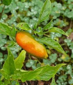 Many peppers are called Aji amarillo as it simply translates into 'Yellow Pepper' and hence is alternative name, Aji yellow. The fruits start off green maturing to orange, typically 120 days after transplanting. The fruits are quite pungent and are usually dried and powdered for use in many Peruvian and Bolivian dishes. 40,000-50,000 Scoville units places them at the medium/hot pungency end of the heat scale. Listed as United States Department of Agriculture (USDA) variety PI 152217.[1]