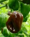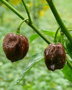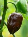 Jamaican hot chocolate is a habanero-type chilli pepper. The fruit are deep chocolate-brown when ripe and ribbed or wrinkled, resembling large dates or prunes. Fruits are 4-5cm (1½-2in) long and with a very hot Caribbean flavour that is strong and smoky. This strain originated from a pepper found in a market in Port Antonio, Jamaica.[1]