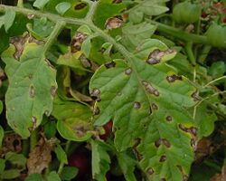 | Septoria leaf spot (Septoria lycopersici) on a Tomato leaf | |